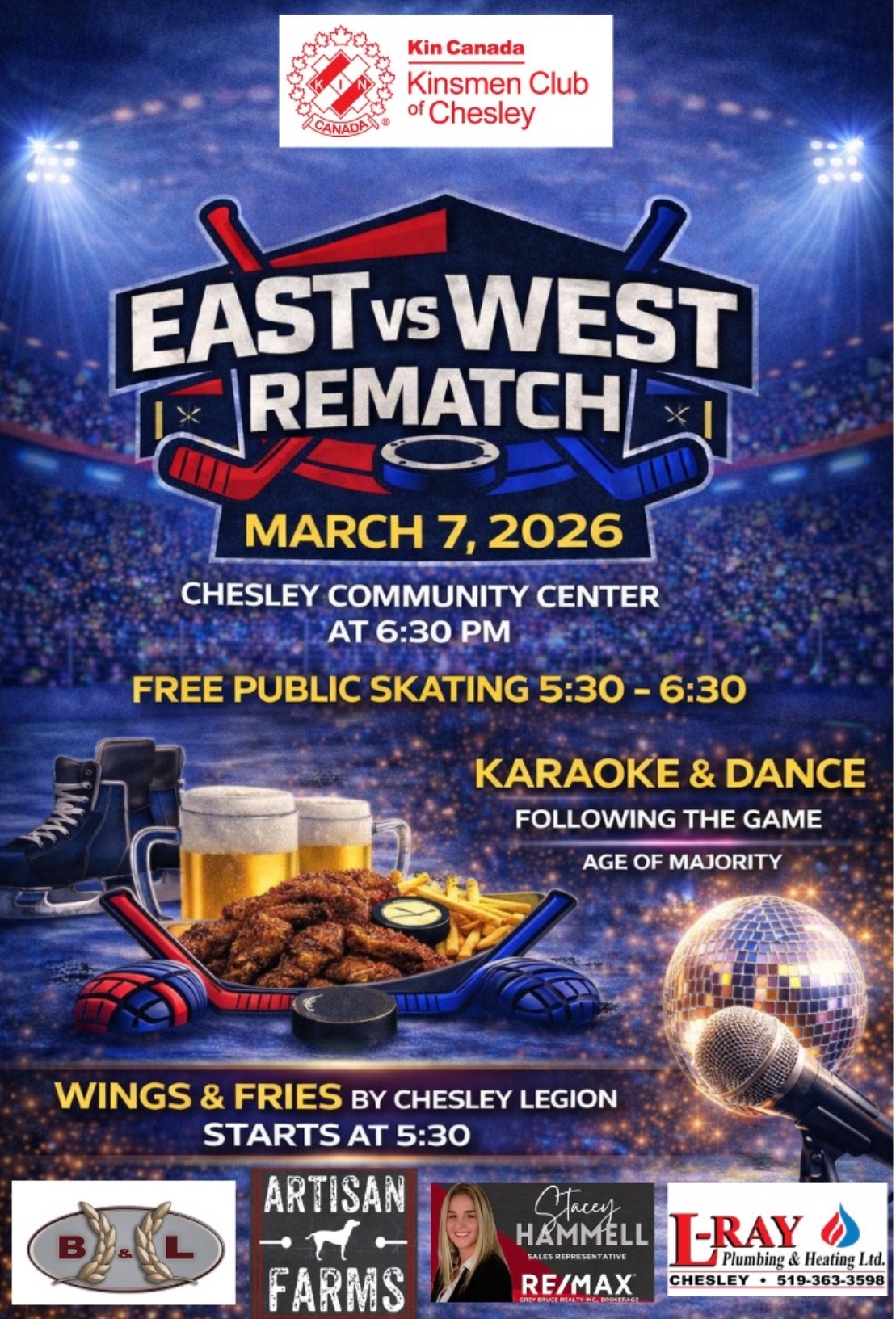 The Kinsmen Club of Chesley is proud to present the 2026 East vs. West Hockey Game! Join us for an exciting evening with fun for the family, followed by an age of majority Karaoke Dance Party!